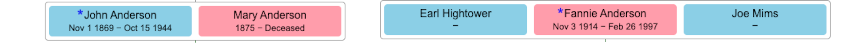 There are two trees on the site. These trees are graphs with the root family member (for example, John H. Anderson) at the top (or left) of the page. The page will open with the root family member at the center of your web browser.